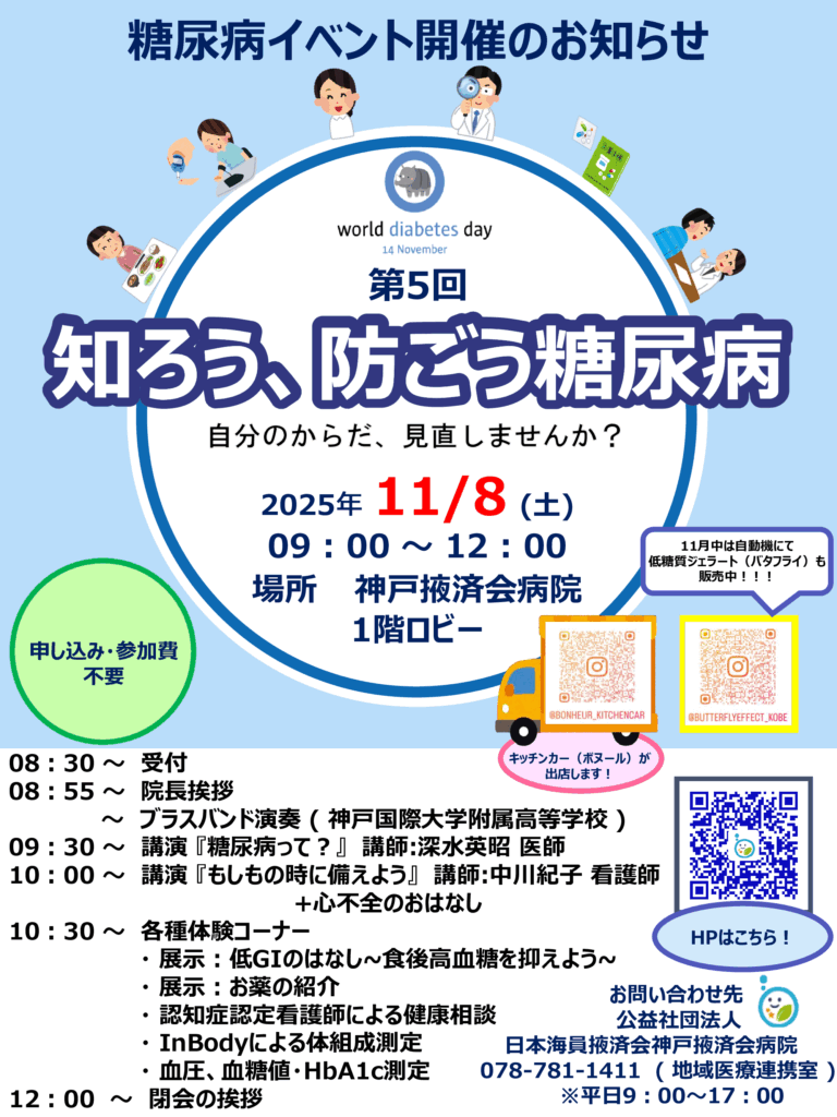 2025年11月8日(土)、神戸掖済会病院1階ロビーにて「第5回 知ろう、防ごう糖尿病」を開催しました。