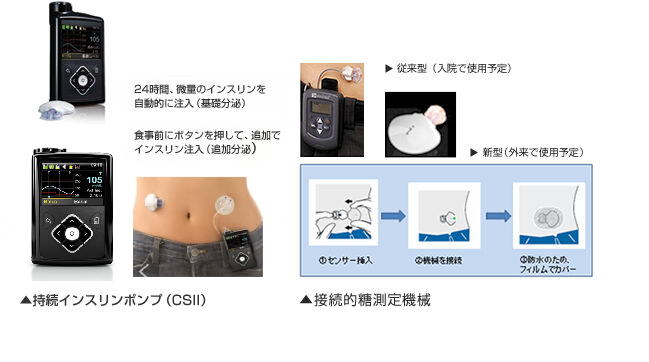 | 1型糖尿病 | インスリン自己注射や、CSII(持続インスリン注入ポンプ)による治療を行います。 |