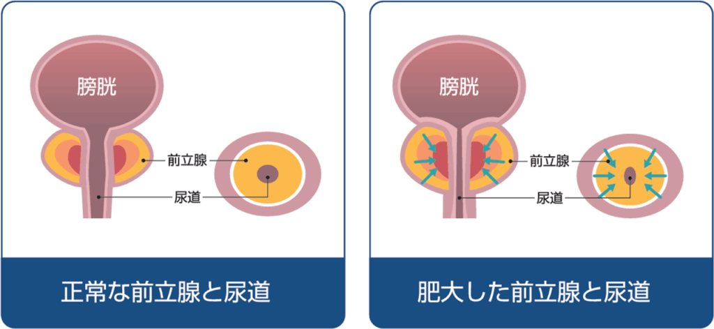 肥大した前立腺が尿道を圧迫することにより、頻尿や残尿、尿閉といった尿にかかわる様々な症状を引き起こす男性特有の病気です。