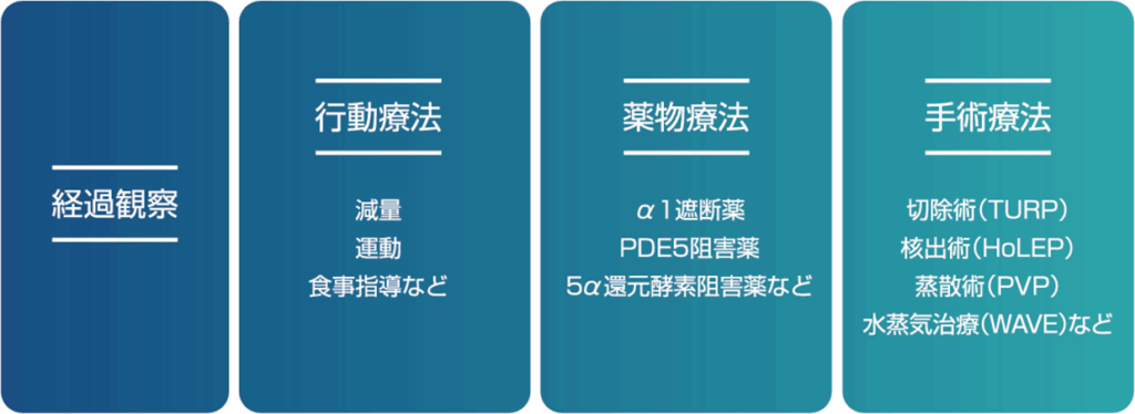 前立腺肥大症の治療法には、「経過観察」「行動療法」「薬物療法」、「手術療法」があります。